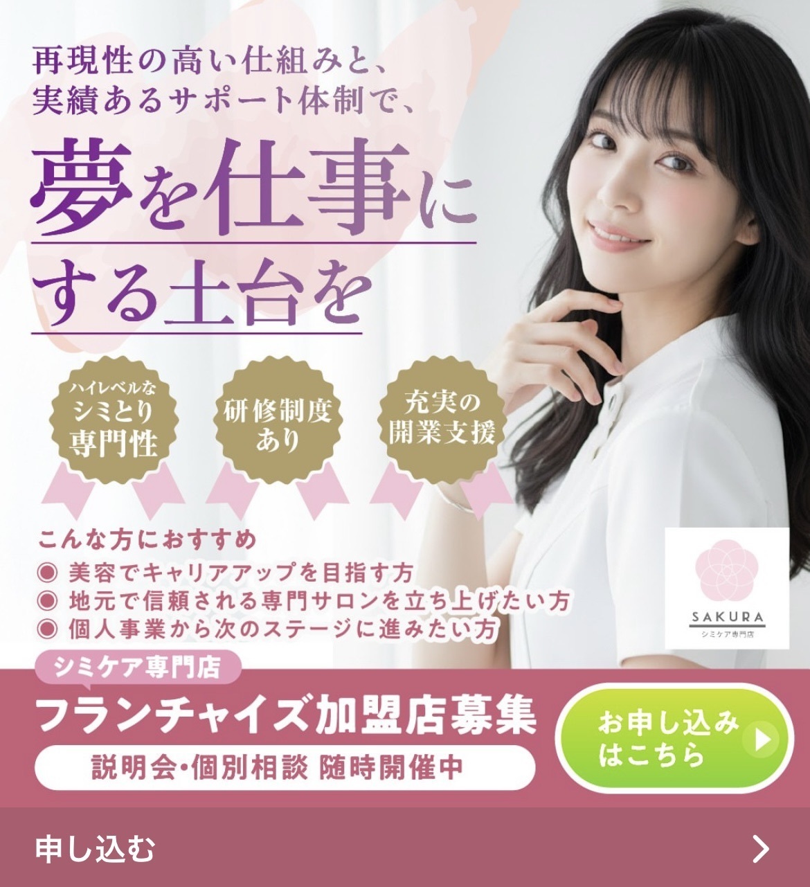専業主婦から一念発起し、シミケア専門店SAKURAを3店舗運営するまでに至った経緯やノウハウを、余すことなく伝授します。